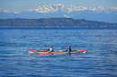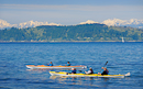 Kayakers in Elliott Bay against backdrop of the Olympic Mountains