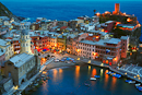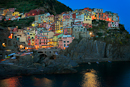 Warm lights illuminate the streets and houses of the Cinque Terre town of Vernazza