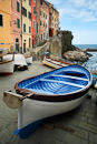 Typical fishing boat rests in Riomaggiore's marina, in Cinque Terre